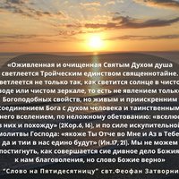 «Оживленная и очищенная Святым Духом душа светлеется Тройческим единством священнотайне. Светлеется не только так, как светится солнце в чистой воде или чистом зеркале, то есть не явлением только Богоподобных свойств, но живым и приискренним соединением Бога с духом человека и таинственным в него вселением, по неложному обетованию: «вселюся в них и похожду» (2Кор.6, 16), и по силе искупительной молитвы Господа: «якоже Ты Отче во Мне и Аз в Тебе, да и тии в нас едино будут» (Ин.17, 21). Мы не можем постигнуть, как совершается сие дивное дело Божия к нам благоволения, но слово Божие верно»