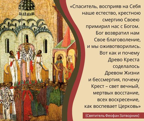 «Грех разлучил между нами и Богом: мы потеряли благоволение Божие и умерли. Спаситель, восприяв на Себя наше естество, крестною смертию Своею примирил нас с Богом. Бог возвратил нам Свое благоволение, и мы оживотворились. Вот как и почему Древо Креста соделалось Древом Жизни и бессмертия, почему Крест – свет вечный, мертвых восстание, всех воскресение, как воспевает Церковь»