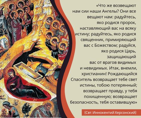 «Что же возвещают нам сии наши Ангелы? Они все вещают нам: радуйтесь, яко родися пророк, наставляющий вас на всяку истину; радуйтесь, яко родися священник, примиряющий вас с Божеством; радуйся, яко родися Царь, защищающий вас от врагов видимых и невидимых. Итак, внемли, христианин! Рождающийся Спаситель возвращает тебе свет истины, тобою потерянный; возвращает правду, у тебя похищенную; возвращает безопасность, тебя оставившую»