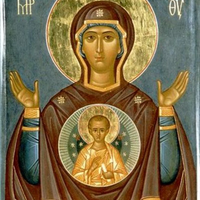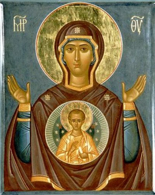 Слово «Оранта» переводиться с греческого языка как «молящаяся». На этой иконе Богородица изображается с поднятыми вверх двумя руками.