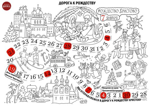 Календарь-раскраска особенно понравится детям. Вы можете придумывать для них свои задания и маленькие подарочки или брать идеи из нашего онлайн-календаря. С этим календарем каждый день будет не просто точкой в календаре, а уникальным шагом по дороге, ведущей к светлому Рождеству Христову.