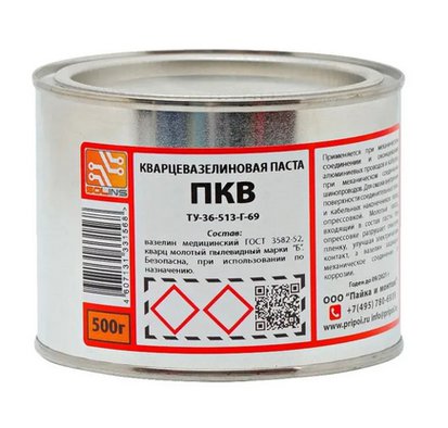 Кварцевазелиновая паста представляет собой густую вязкую смесь медицинского вазелина и молотого кварца, защищающую металлическую поверхность изделий от коррозии. ПКВ SOLINS - густая паста с содержанием абразива, без запаха. Кварцевазелиновая смазка применяется при соединении и оконцевании опрессовкой алюминиевых проводов и кабелей. Внутренняя поверхность соединительных гильз и кабельных наконечников, а также зачищенные концы алюминиевых жил смазываются пастой перед опрессовкой. Мелкий кварцевый песок имеет неправильную кристаллическую форму, острые уголки которого царапают тонкую защитную оксидную пленку алюминиевого провода или жилы, разрушая ее, тем самым улучшая электрический контакт. Чистый вазелин без содержания кислот и щелочей является отличным смазывающим материалом и защищает поверхности механически соединенных проводов от коррозии и окисления. Применение кварце-вазелиновой пасты не освобождает монтажников от необходимости предварительной механической зачистки поверхностей.