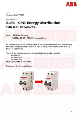 В сообщении говорится: "в качестве ещё одного шага к гармонизации систем pro M и более устойчивому подходу "меньше значит больше" мы удалим метку RFID с наших RCBO (АВДТ) ABB. Метка удалена с продукции следующих серий: DS201; DSH201; DSP201