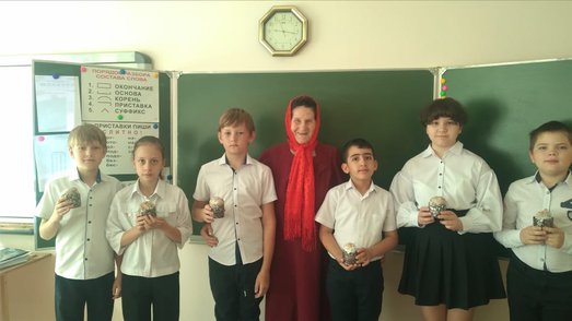 От имени Фонда Свет Ангела и хрма, Любовь Пантелеимоновна поздравила всех с праздником Светлой Пасхи, пропела: Христос Воскресе! Напомнила детям, в честь какого события верующий народ торжественно возглашает: Христос Воскресе и красит яйца, освещает куличи.