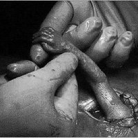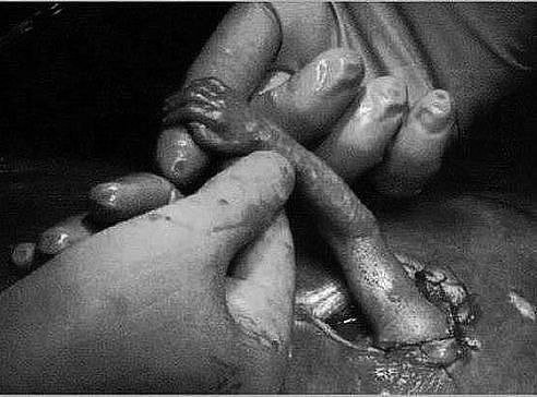 Эта фотография была сделана в 1999 году и опубликована в американском журнале. Автор фотографии «Майкл Клэнси» назвал свое фото «Рука надежды». Это необычное фото удалось сделать во время хирургической операции, которую проводил хирург Джозеф Брюнер. Пациенткой была женщина на 21 неделе беременности, у которой была выявлена патологии развития плода. Младенцу поставили диагноз врожденного дефекта позвоночника, который не позволяет человеку держаться прямо и нормально ходить. Доктор предложил родителям выход: хирургическую операцию, при которой делается кесарево сечение, извлекается матка из брюшной полости и через небольшой надрез оперирует младенца. Такая рискованная операция давала шанс ребенку родиться здоровым. И вот когда операция близилась к концу сквозь отверстие в матке просунулась маленькая ручонка и схватила хирурга за палец, как бы благодаря его за спасение. Надо сказать, что доктор был ошеломлен и не мог двинуться с места, вот этот момент и удалось запечатлеть фотографу. Кстати оперированный ребенок родился в срок и абсолютно здоровым. Родители назвали его Сэмюэль.