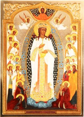 Невеста неневестная. Отлична от "Радуйся, Невеста Неневестная", Серафимо-Дивеевской Умиления, перед которой молился Серафим Саровский. Ничего не могу найти, откуда она взялась, где сейчас находится, каково символическое значение, что за святые изображены... Руки у неё здесь связаны венчальным рушником, всё, что знаю. Может, кто-то слышал о ней что-то?