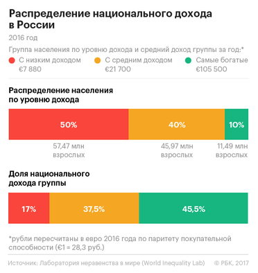 Доход, приходящийся в среднем на одного взрослого россиянина, в 2016 году составил €23, 2 тыс. за год, что по методологии авторов соответствует около 55 тыс. руб. в месяц. Но на самом деле доходы распределены крайне неравномерно: 50% населения (57, 5 млн человек) получили в среднем только по €7, 8 тыс. Наиболее обеспеченные 10% граждан (верхний дециль) располагали средним доходом в €105, 5 тыс., следует из расчетов исследователей.