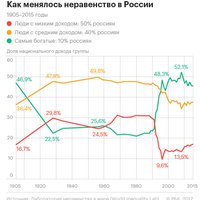 Если упорядочить всех взрослых россиян по уровню дохода и разделить на две половины, то на долю первой группы будет приходиться лишь 17% национального дохода* в 2016 году, на долю второй — 83%. При этом доходы богатейших 10% граждан составляют 45, 5% национального дохода. Это почти совпадает с распределением дохода в 1905 году (см. график). Данные по 1905 году основаны на историческом документе — таблице распределения доходов, подготовленной фискальными органами царской России в преддверии возможного введения подоходного налога.