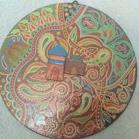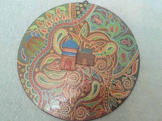 Евдокия, Доброго Вам времени суток!!! Я начинал с гуаши, но так как она быстро расходовалась, мне надо было перейти на другие краски.. Я приобрел водо-эмульсионную краску и строительные колера, в итоге смешивая их можно добиться разных оттенков..На пластинки я перешел из-за нехватки тарелок..Сначала делаю темный грунтовочный фон теми же красками и раскрашиваю, потом лакирую 2-3 слоя.В середине находятся сооружения стилизованные в восточном стиле, сделанные из соленного теста.