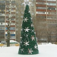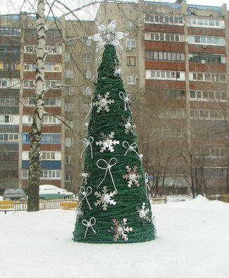 Вот такую елочку сделала к Новому году. Джутовый шпагат, пайетки в виде снежинок, бусины, бисер. В высоту 26 см. Снимала во дворе дома.