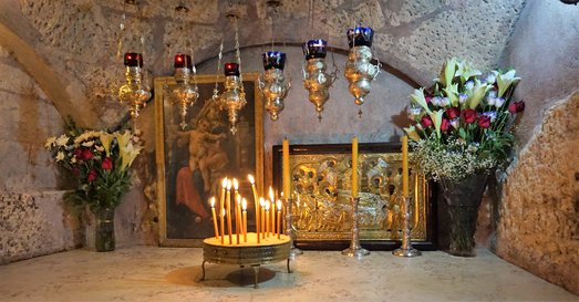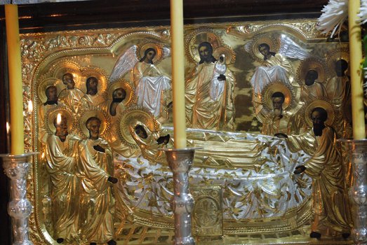 Велича́ем Тя, Пренепоро́чная Ма́ти Христа́ Бо́га на́шего, и всесла́вное сла́вим Успе́ние Твое́!