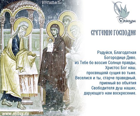 15 февраля Русская Церковь празднует Сретение Господне. Славянское слово «Сретение» буквально означает встречу. Символически в лице праведного Симеона и младенца Христа встретились Ветхий и Новый Завет, человечество и Бог.