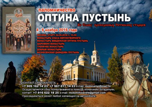 Федерация мототуризма России с 4 по 6 ноября 2016 года приглашает в паломническую поездку по маршруту монастырь Спаса Нерукотворного, Введенская Оптина пустынь, Шаровкин монастырь, Добрый монастырь, Гремячев монастырь, Воскресенская Давидова пустынь