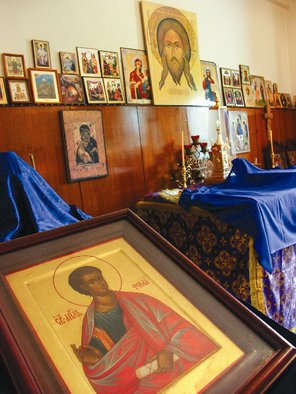 Домовый храм расположился на втором этаже посольского клуба. Это, собственно, небольшая комната размером пять на четыре метра, без иконостаса, с открытым алтарем. На стенах множество небольших икон из России, а на особом месте стоит по заказу написанный образ апостола Фомы – проповедника христианства в Индии и небесного покровителя прихода.