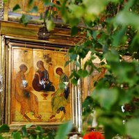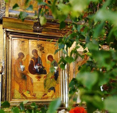 Ви́дехом Свет и́стинный,/ прия́хом Ду́ха Небе́снаго,/ обрето́хом ве́ру и́стинную,/ Неразде́льней Тро́ице покланя́емся:// Та бо нас спасла́ есть.