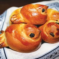 «Голубки», как и «жаворонки», изготавливаются из жгута теста, который надо раскатать так, чтобы один конец был тонким и гибким — головка, а все тело потолще, удлиненное, его надо слегка примять пальцами. Хвост веерообразно надрезать ножиком. Для крылышек тесто тонко раскатать, вырезать крылышко, надрезать перышки, смазать чаем, последняя деталь — изюминки-глазки.