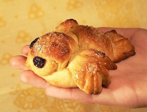 Можно сделать и так: раскатать тесто, вырезать кружочки, диаметром 6-8 см, надрезать (не до самой серединки!) сегмент немного меньше четверти – это будет хвост. Взять левую от хвоста часть и завернуть ее направо, правую – налево. Аккуратно сформировать голову, вытянуть пальцами клювик, вставить глазки-изюминки.