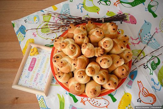 Делать «жаворонков» лучше с детьми. Маленькие дети справятся с изготовлением колобков. Колобки делаются совсем просто. Валик теста нарезать на куски, скатать из них шарики, положить на смазанный маслом металлический лист (противень), дать время для расстойки, после чего смазать с помощью кисточки чаем, тогда после выпечки колобки действительно будут иметь гладкую, блестящую, золотистую поверхность (колобаны золотые).