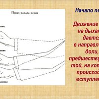 От неподвижной позиции внимания руки начинают определенное движение на само дыхание, а легкая, мгновенная, более ощущаемая, чем заметная, волна предварительного движения пробегает по руке, чуть приподнимая запястье, и затем уже переходит в самый жест, показывающий хору дыхание. Чтобы органически связать эти два жеста (предварительное движение и сам жест на дыхание), сделать их нужными и понятными, необходимо большое чувство меры и дирижерская грамотность.