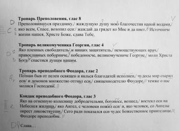 Фотография части листка тропарей для службы, на которой пели два человека – бас и альт. Соответственно, тональности опущены для альта, поющего сопрановую партию.