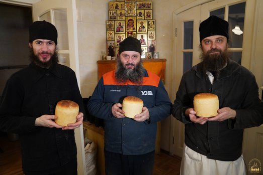 Через полтора часа печь нагрелась до температуры для выпечки хлебов. После сбора углей отец Софроний произвёл замер температуры двумя способами — современным при помощи термометра и древним с помощью муки. Температура оказалась свыше 300 градусов, что выше положенной. После охлаждения пода печи до нужной температуры в 250 градусов была произведена закладка форм в печь, и после 35 минут нахождения в печи румяные буханки хлеба были вынуты братией из печи, поставлены на хлебные полки и накрыты полотенцем.