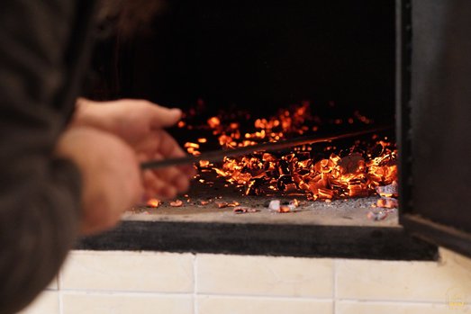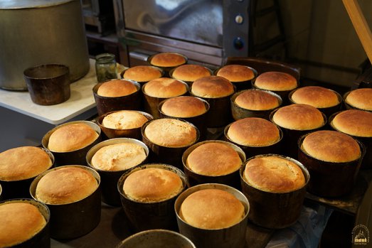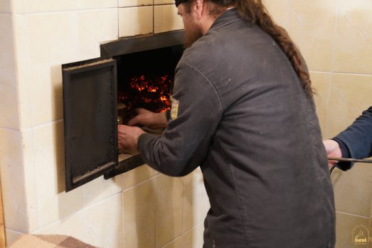 Как сейчас возжигается огонь в старой печи на дровах в Святогорской Лавре мы узнали в старой пекарне, где продолжили наблюдать за выпеканием хлебов. Как правильно разжечь печь, какие дрова использовать, как их правильно укладывать, чтобы быстро разогреть под печи до нужной температуры рассказал и показал в действии архимандрит Софроний (Цап), который уже имел опыт использования такой печи в первые годы после воссоздания обители, когда электропечей ещё не было. Отец Софроний после укладки разжёг огонь печи от неугасимой лампады святого угла, который устроен здесь же, напротив печи. Отец Григорий и иеродиакон Макарий быстро управились с закладкой теста в формы и поставили первую партию в 30 буханок в расстоечные шкафы, в которых тесто поднимается и заполняет форму полностью.