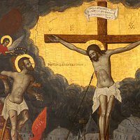 Но он ведь не только себе в этом отчет дает, не только товарищу об этом сообщает: в следующем стихе Евангелия от Луки (23: 42) он обращается с этим к распятому рядом Безгрешному.
