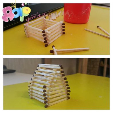 Строим домик так, как показано на фотографии, соединяя спички клеем. Чтобы сделать зауженную крышу, укорачиваем спички. Поделка особенно понравится мальчикам. Так можно построить целую деревню!