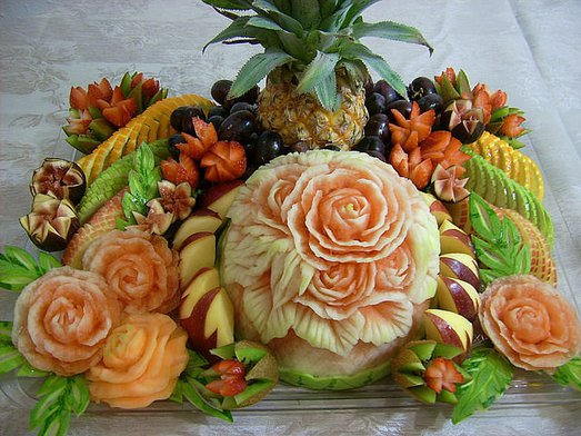 Сейчас ни одна кулинарная выставка или продуктовое шоу не обходится без демонстрации украшения столов различными резными композициями из овощей и фруктов.