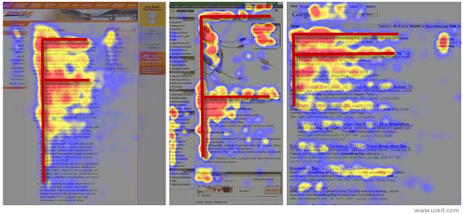 В ходе исследований выяснилось, что страницы в интернете, как уже говорилось, не читаются, а бегло просматриваются по шаблону, напоминающему латинскую букву F. Пользователь сначала считывает несколько первых строк текстового содержимого страницы (иногда даже полностью, от начала до конца), затем перескакивает на середину страницы, где считывает еще несколько строк (как правило, уже лишь частично, не дочитывая строки до конца), а затем быстро спускается к самому низу страницы — посмотреть, «чем дело кончилось».