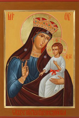 Перед нами довольно редкая иконографии: Богородица держит Младенца на левой руке, а правой благословляет священническим благословением. Свидетельства рассказывают, что именно из этой правой руки истекало миро из оригинала иконы.