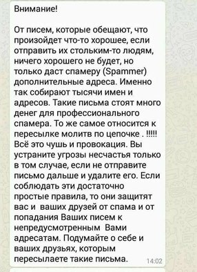 Приходится сталкиваться с такими письмами. Как могу объясняю. Обычно человек не задумываясь пересылает, только потому, что подобное переслал кто-то из знакомых.