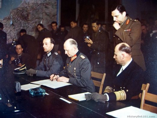 В 2 часа 41 минуту в Реймсе, в штабе Эйзенхауэра, Йодль подписал Акт капитуляции Германии. Согласно реймсскому акту объявлялось о безоговорочной капитуляции всех сухопутных, морских и воздушных вооружённых сил, находящихся в момент подписания протокола под германским контролем. Командующий группой армий «Центр» Шёрнер отказался выполнить требование о капитуляции и начал отвод войск на запад.