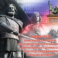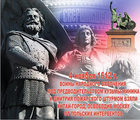 4 ноября 1612 года воины народного ополчения под предводительством Кузьмы Минина и Дмитрия Пожарского освободили Москву от польских захватчиков, продемонстрировав образец героизма и сплочённости всего народа вне зависимости от происхождения, вероисповедания и положения в обществе.