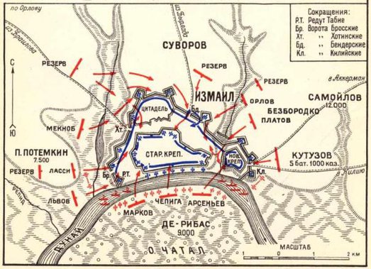 Он разделил свои войска на 3 отряда по 3 колонны в каждом. Отряд генерала П.С. Потемкина должен был штурмовать крепость с запада, отряд генерала А.Н. Самойлова - с востока, а отряд генерала О.М. Дерибаса, высаженный с кораблей Лиманской военной флотилии - южные укрепления, прикрывавшие город со стороны Дуная.