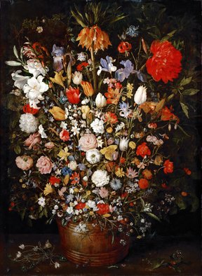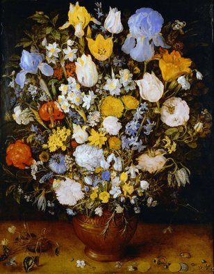 Так же знаменитыми являются его натюрморты, в которых преобладает цветочная тематика и большая детализированность во всех деталях. Надо сказать, что цветы, что писал Ян Брейгель Старший, росли в королевской оранжерее, куда ему был открыт доступ. Большинство цветов были крайне редкими, необычными для тех мест, где он родился и жил. В одном из писем 1606 года мастер рассказывает интересные подробности о работе: «… он (натюрморт) замечательно удастся: не только потому, что он написан с натуры, но и благодаря красоте и редкостности состоящих его различных цветов, неизвестных и никогда не виданных прежде: я потому и ездил в Брюссель, чтобы писать с натуры некоторые цветы, которых не увидеть в Антверпене». Ян Брейгель выполнял тщательные рисунки акварелью и гуашью, рисуя цветы с натуры в разных ракурсах, при разном освещении. А потом их использовал для создания натюрморта. Это был обычный метод работы великого живописца.