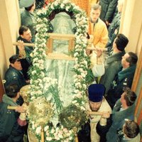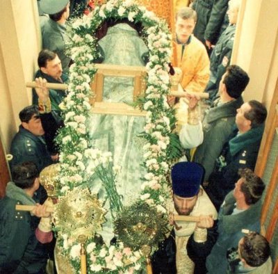 Крестный ход с мощами святителя Луки Крымского (Войно-Ясенецкого) в Симферополе. На покрове мощей на фотографии проявились лик и святительские одежды святого.