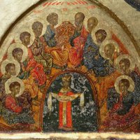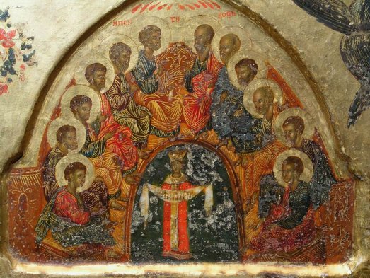 Совместно молились апостолы и в десятый день по Вознесении Господа. Внезапно послышался шум, и появились разделяющиеся огненные языки, которые почили на каждом из них. Апостолы исполнились Святого Духа и стали говорить иными языками (см.: Деян. 2:4).