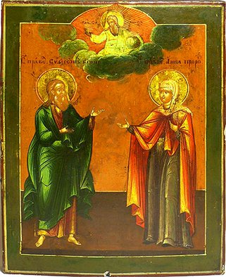 Праведная Анна Пророчица происходила из колена Асирова, была дочерью Фануила. Вступив в брак, она прожила с мужем 7 лет до его кончины. После его смерти праведная Анна проводила строгую благочестивую жизнь, "не отходила от храма, постом и молитвою служа Богу день и ночь" (Лк. 2:37). Когда праведной Анне было 84 года, она удостоилась видеть в Иерусалимском храме Младенца Иисуса Христа, принесенного для посвящения Богу. Святая Анна - покровительница монахинь, вдов и одиноких женщин. Ей молятся о благочестивой жизни во вдовстве и одиночестве, об удержании похоти, об укреплении сил в посте и молитве, о поддержке в бездетности.