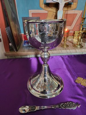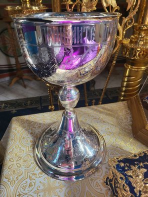 чаша для Евхаристии объёмом 2 л сделана и сегодня прибыла в храм. В неделю Ваий послужим на ней.