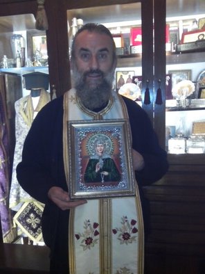 Имея внутреннюю духовную красоту, не мог отец Поликарп хранить её только для себя. По воле Божией стал он 1991 году настоятелем монастыря Кассопитра. Во всём монастыре он один монах. Живёт в пристройке к храму, о котором мне бы хотелось рассказать подробнее. Храм Кассопитры – настоящая жемчужина Корфу, именно здесь находится чудотворный образ Царицы Небесной, называемой Кассопитра. На этой иконе изображено чудо, произошедшее в небольшом селении Кассиопи на севере острова. В XVI веке по молитвам перед чудотворной иконой «Неувядаемый Цвет» в Кассиопи Сама Царица Небесная явилась к неповинному слепому Стефану, которому выкололи глаза, и даровала ему новые очи. С тех пор, в знак чуда, на острове Корфу и по всей Греции стали появляться храмы, посвященные чуду и иконы, на которых Пресвятая Богородица склоняется над юношей и вкладывает ему новые глаза. Один из наиболее древних образов с изображением этого чуда – та самая икона, находящаяся в монастыре у отца Поликарпа. Этот образ считают чудотворным и к нему стекается ничуть не меньше паломников, чем в селение Кассиопи к образу «Неувядаемый Цвет». Чудотворный образ украшен пастырскими крестами и различными драгоценностями, оставленными в дар мирянами для Пресвятой Богородицы. До этой иконы сложно дотянуться, поэтому перед ней находится список: небольшая копия, расположенная чуть ниже. К нему имеет доступ каждый приходящий поклониться святыне и излить свою мольбу Пречистой Деве Богородице. Войдя в храм, в первую очередь человеческий взгляд падает на ковёр в центре с изображённым на нём двуглавым орлом. Яркий и одновременно строгий настил принял на свою поверхность стол-мощевик. Да-да, самый настоящий стол с прозрачной стеклянной крышкой, водружённой сверху, под которой находятся частицы чудотворных мощей святых. Если сделать десяток шагов от центральной части храма в левую сторону перед нами предстаёт комната, при входе в которую каждого православного христианина встречает преподобный Серафим Саровский и блаженная Матрона Московская. Я рассказываю о них, как о живых не только в Вечности, а так, как будто они находятся в храме, а не на иконах. Возможно, такое ощущение моё сознание сложило из комментариев отца Поликарпа. Он называет преподобного отца Серафима и блаженную старицу Матрону своими папой и мамой, которые всегда находятся рядом с ним, в его любимом Божьем доме – монастыре Кассопитры. В этой удивительной комнатке у отца Поликарпа находится более сотни святынь и мощей святых угодников Божиих, в ковчегах и небольших коробочках-мощевиках, но для мирян выставлены не все. Батюшка сам чувствует, когда и кому выносить те или иные мощи. Одна из великих святынь этой комнаты – всегда тёплая частица десницы целителя Пантелеимона.