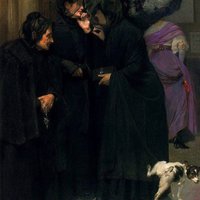 Когда смотришь на эту картину, взгляд первым делом падает на трех женщин, которые о чем-то шепчутся. Далее мы замечаем женщину на заднем плане, которая, скорее всего, и стала предметом обсуждения. Третья деталь в виде маленькой собачки в полной мере раскрывает название и комичность картины «Наказание сплетницы».