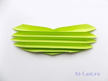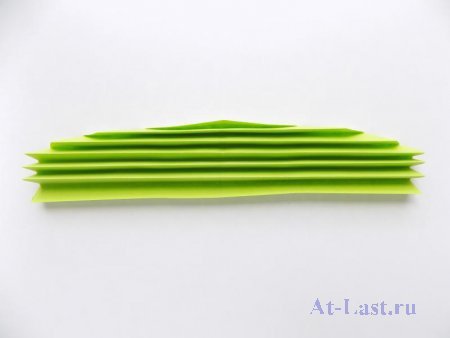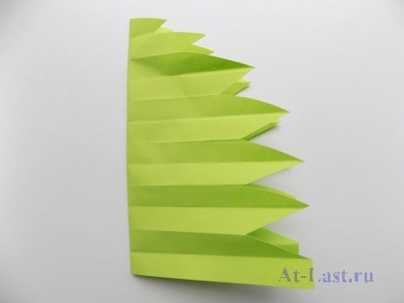 Оставшийся зелёный лист снова складываем пополам. Теперь согнём его в другом направлении. В верхней части закруглим заготовку ножницами. Далее разворачиваем лист бумаги и начинаем складывать его «гармошкой». Расправим «гармошку» и снова согнём пополам в поперечном направлении. Потом по краю листа выполним зигзагообразные вырезы. Снова складываем лист «гармошкой». Сгибаем почти готовый лист пальмы пополам.