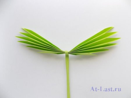 Теперь займёмся изготовлением черешка листочка пальмы. Для этого отрезанный ранее прямоугольник бумаги скручиваем в тонкую трубочку, край подклеиваем. С одного конца эту трубочку слегка расплющим, после чего обернём кончик вокруг середины листочка. Теперь с помощью клея зафиксируем этот черешок на листочке пальмы. После этого соединим клеем половинки самого зелёного листа пальм:
