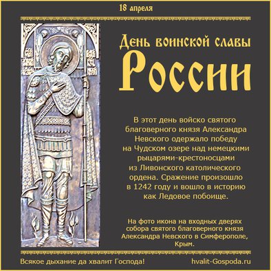 О, святой воин Христов Александр! Услышь, нас, недостойных, испроси у Христа Бога дарования нам ПОКАЯНИЯ и ПРОЩЕНИЯ грехов, умягчения наших ожесточенных сердец и вселения в них любви; воцарения мира между Россией и Украиной и воссоединении наших народов; защиты от дьявольских сил, сеющих вражду между нами и льющих потоки лжи, и ПОБЕДЫ над ними. Моли Бога о защите России от врагов внешних и внутренних. Умоли Господа явить нам и нашим правителям СВОЮ волю и даровать сил и терпения, чтобы ее исполнить. Аминь!