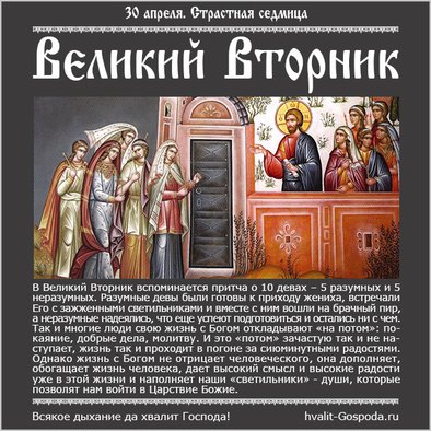 30 апреля. Великий Вторник. Воспоминание притчи о 10 девах и Страшном суде; напоминание о необходимости духовного бодрствования | Всякое дыхание да хвалит Господа!