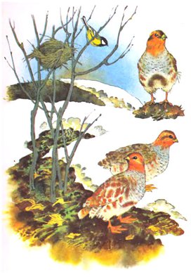 В поле, в кустах, жили серые куропатки - красивые такие полевые курочки с шоколадной подковкой на груди. Целая стая их тут жила, зерна из-под снега выкапывала.