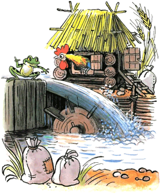Лягушка, мошка, ежик и петушок нашли телегу с разными колесами и решили их домой забрать. Увидел это заяц и давай над ними смеяться. Но, зайдя к ним в гости, заяц понял, что в умелых руках и разные колеса могут пригодиться.