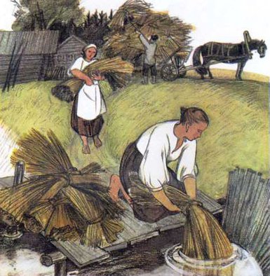 Когда лён просох, то стали у него головки отрезывать, а потом потопили в речке безголовые пучки и ещё камнем сверху завалили, чтобы не всплыл.