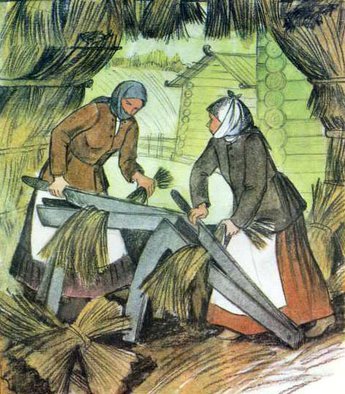 Настали длинные зимние вечера. Сёстры Тани надели лён на гребни и стали из него нитки прясть.